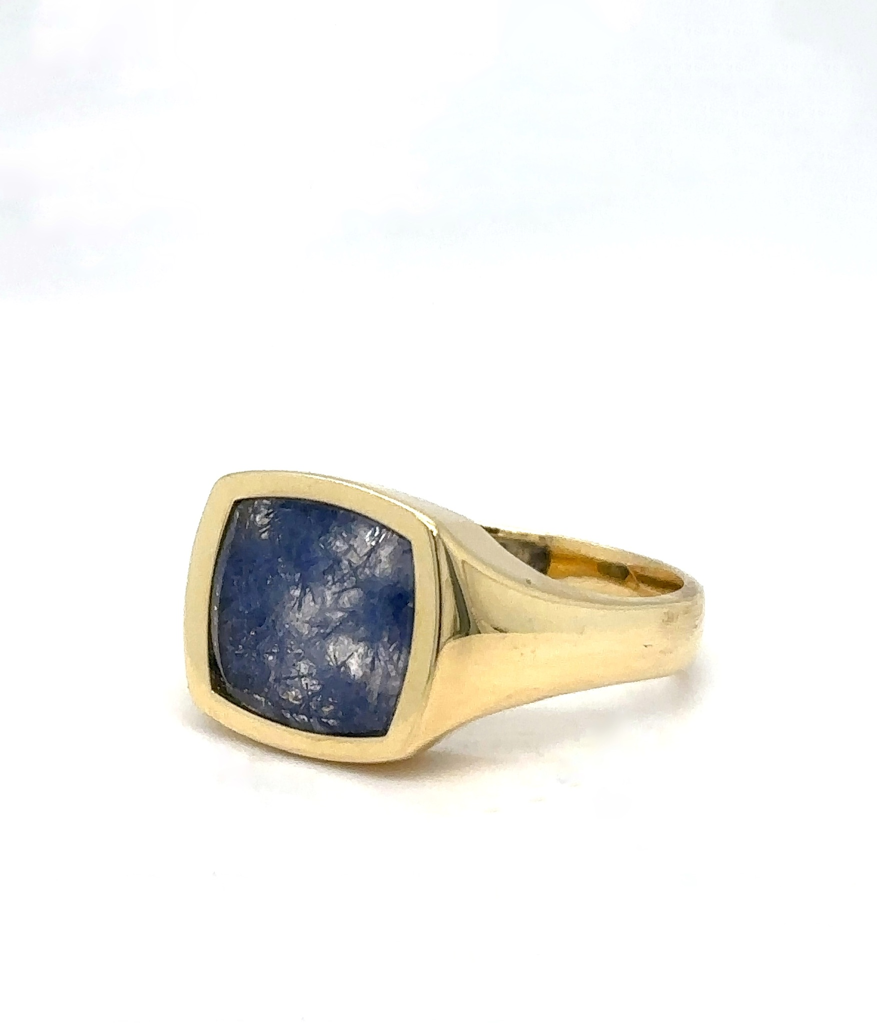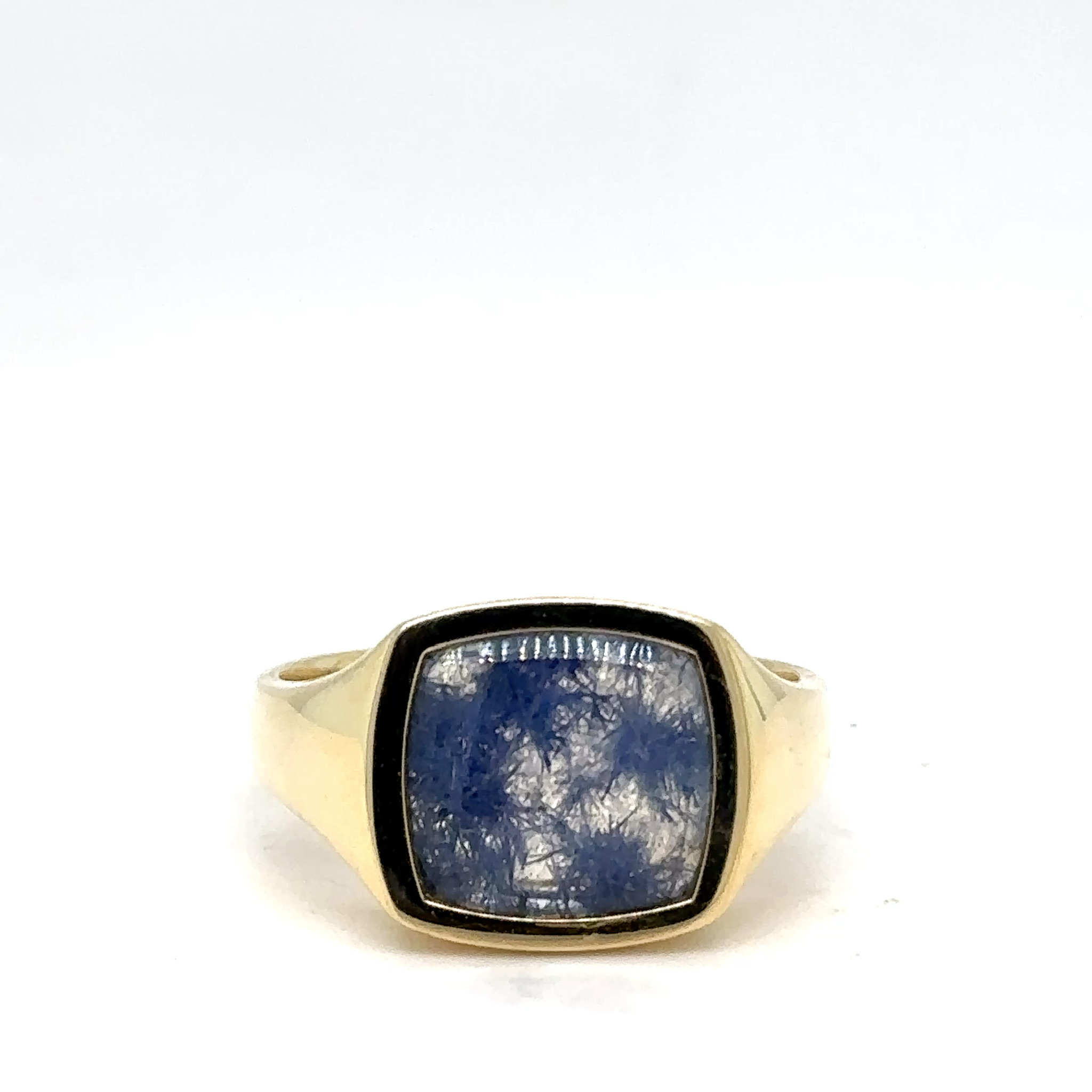 De ring is gezet met een unieke Dumortierietkwarts, herkenbaar aan zijn diepe blauwtinten en natuurlijke, wolkachtige insluitsels. Elke steen is volledig uniek en geeft de ring een eigen karakter en diepte.