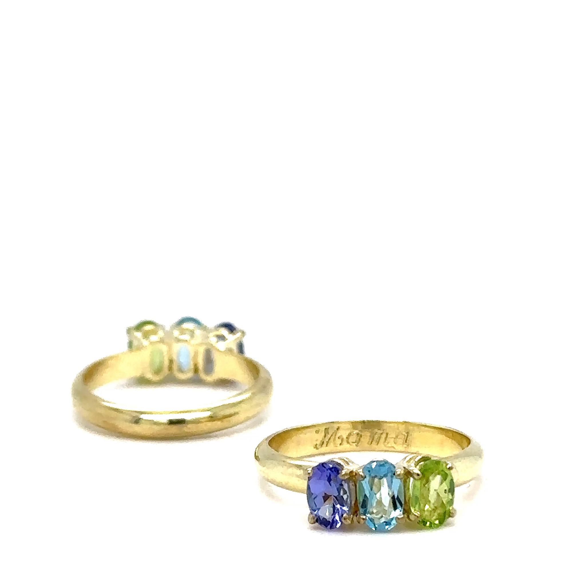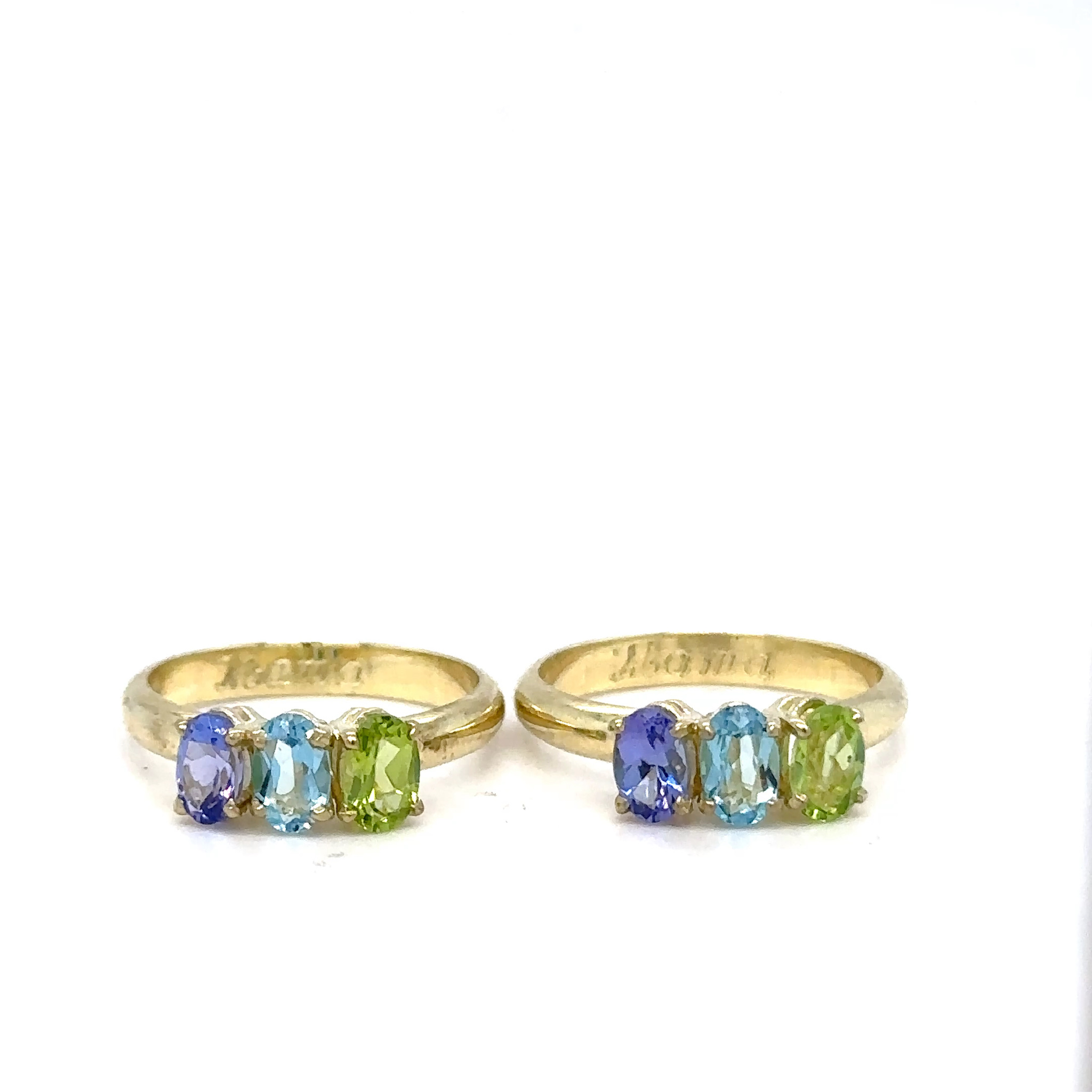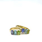 Elke ring bevat peridot, aquamarijn en tanzaniet: drie edelstenen, elk met een eigen betekenis, harmonieus met elkaar verenigd.