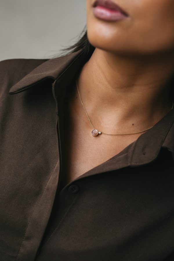 Naast de maansteen is een diamant van 0,03 ct gezet in een geelgouden zetting. Dit zorgt voor een subtiele schittering en een verfijnd contrast.