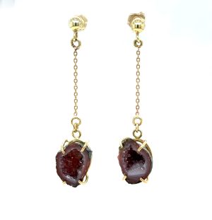 14 karaat geelgouden oorstekers met rood / bruin zirkoon en bladvormig geslepen Jaspis