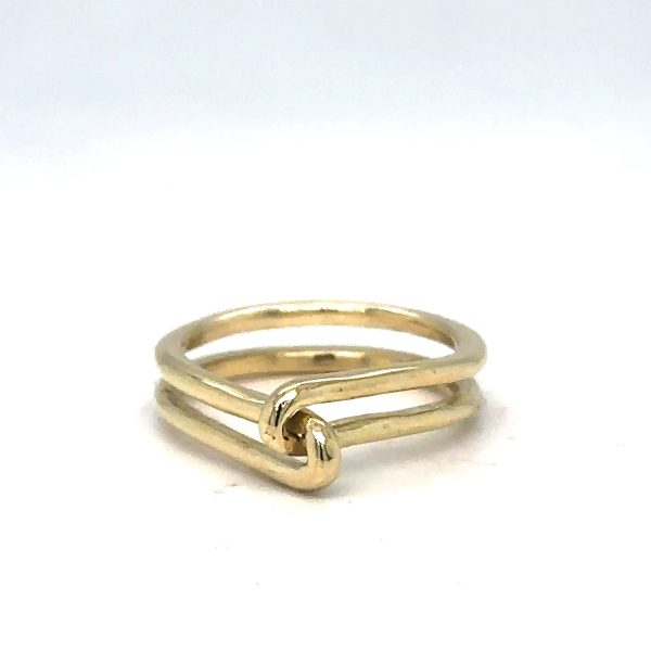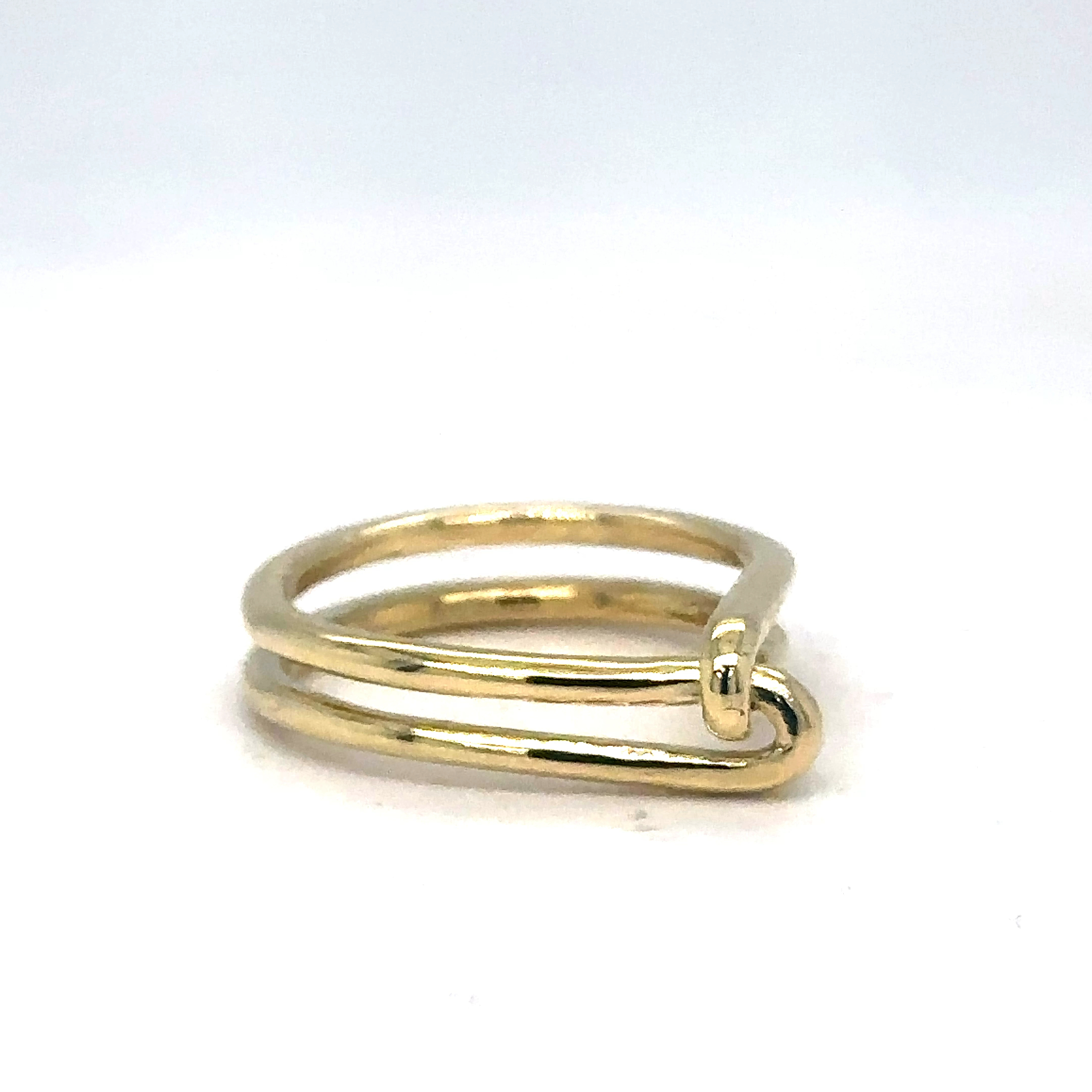 Deze bijzondere ring is gemaakt van oud goud en draagt daarmee een verhaal dat al bestond. Het vloeiende, open ontwerp symboliseert verbondenheid en bescherming.