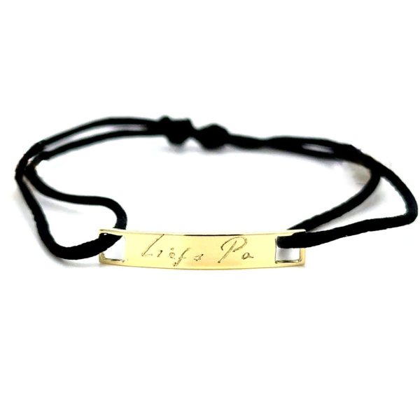 14 karaat geelgouden plaat met satijnenkoord met gravure in eigen handschrift p.o.a.