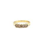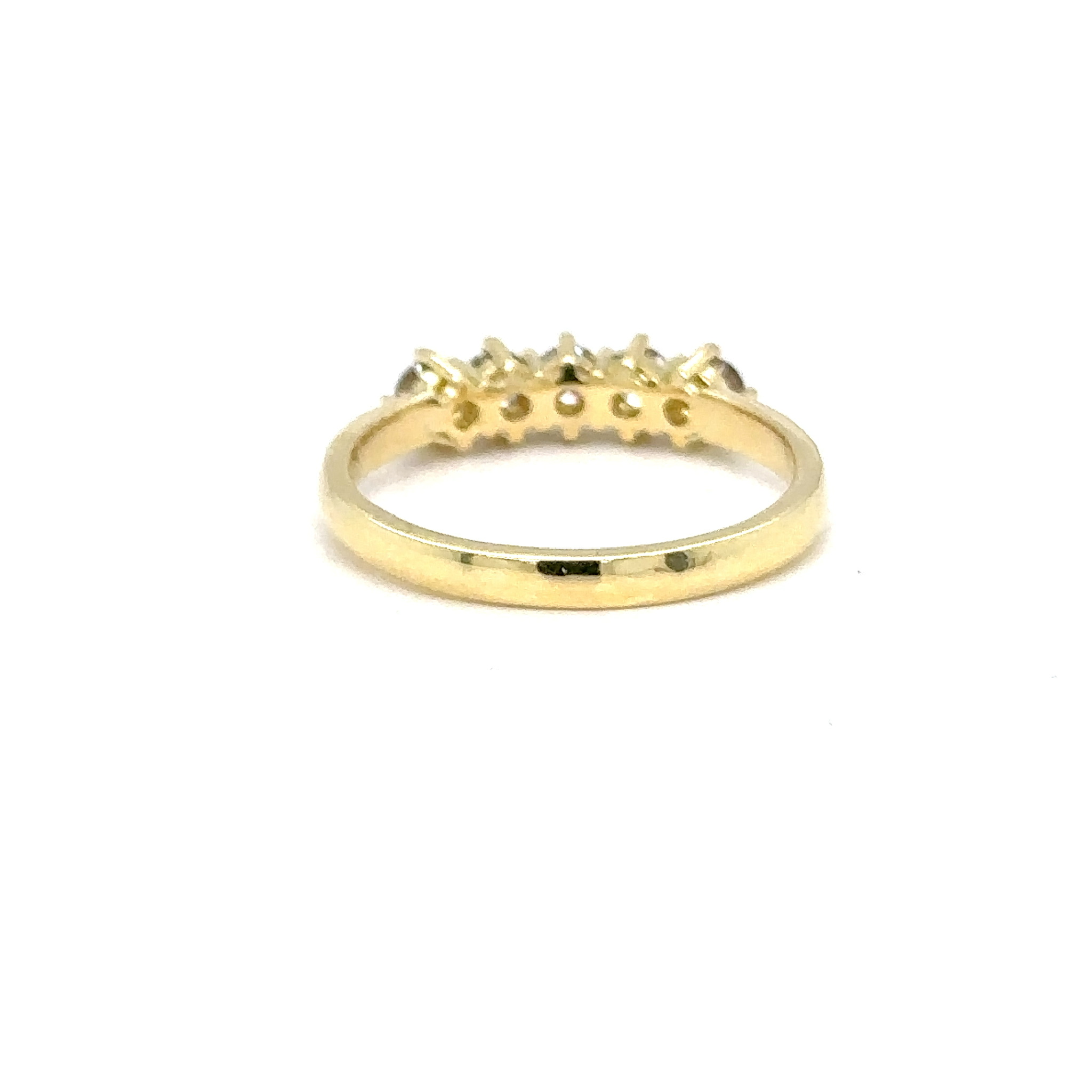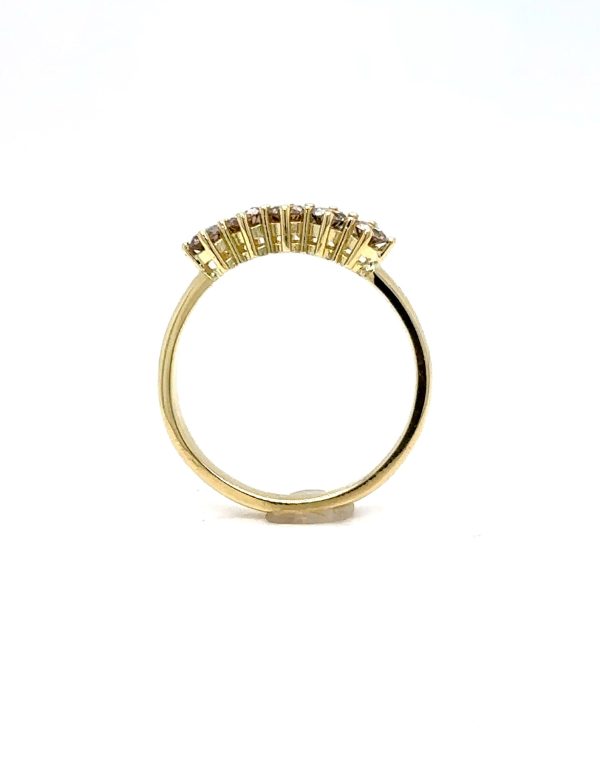 Elegante ring vervaardigd uit 18 karaat geelgoud, bezet met vijf schitterende bruine diamanten. De diamanten zijn in een verfijnde rij geplaatst en zorgen voor een warme, sprankelende uitstraling.