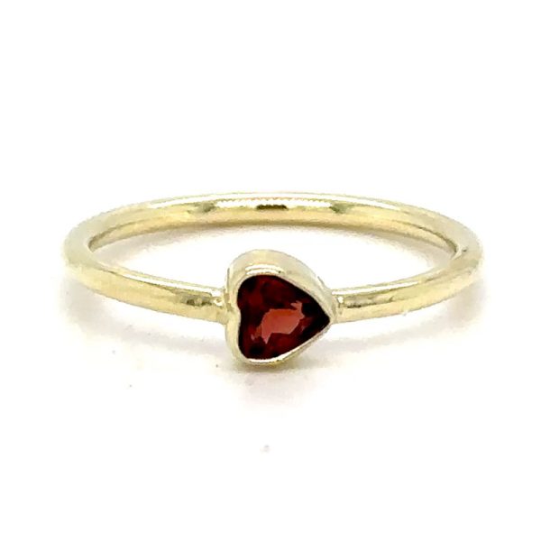Een 14 karaats geelgouden ring met als stralend middelpunt een hartvormige granaat. De steen is horizontaal over de band geplaatst, wat het ontwerp een speels en eigentijds karakter geeft, terwijl de diepe rode kleur van de granaat warmte en elegantie uitstraalt.