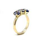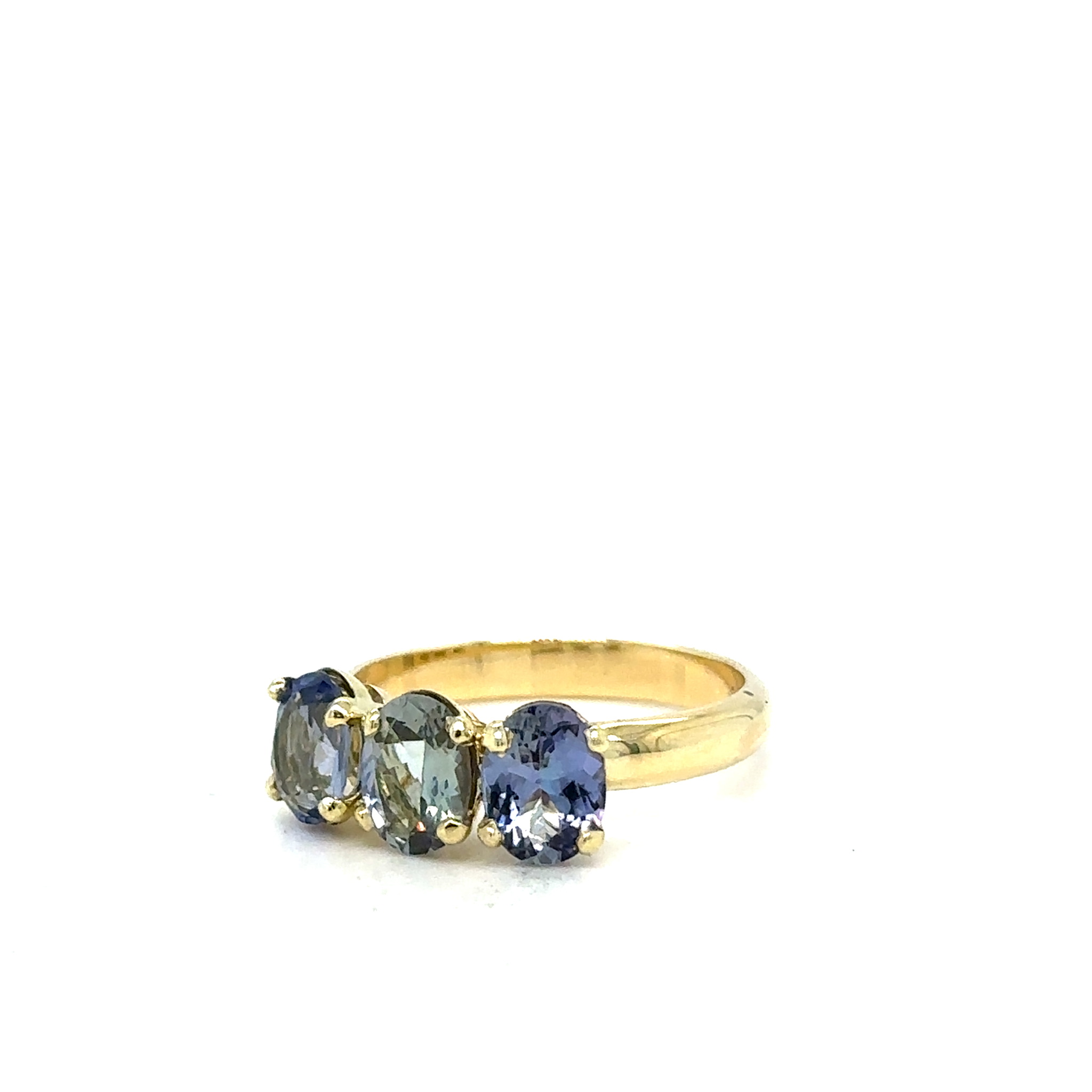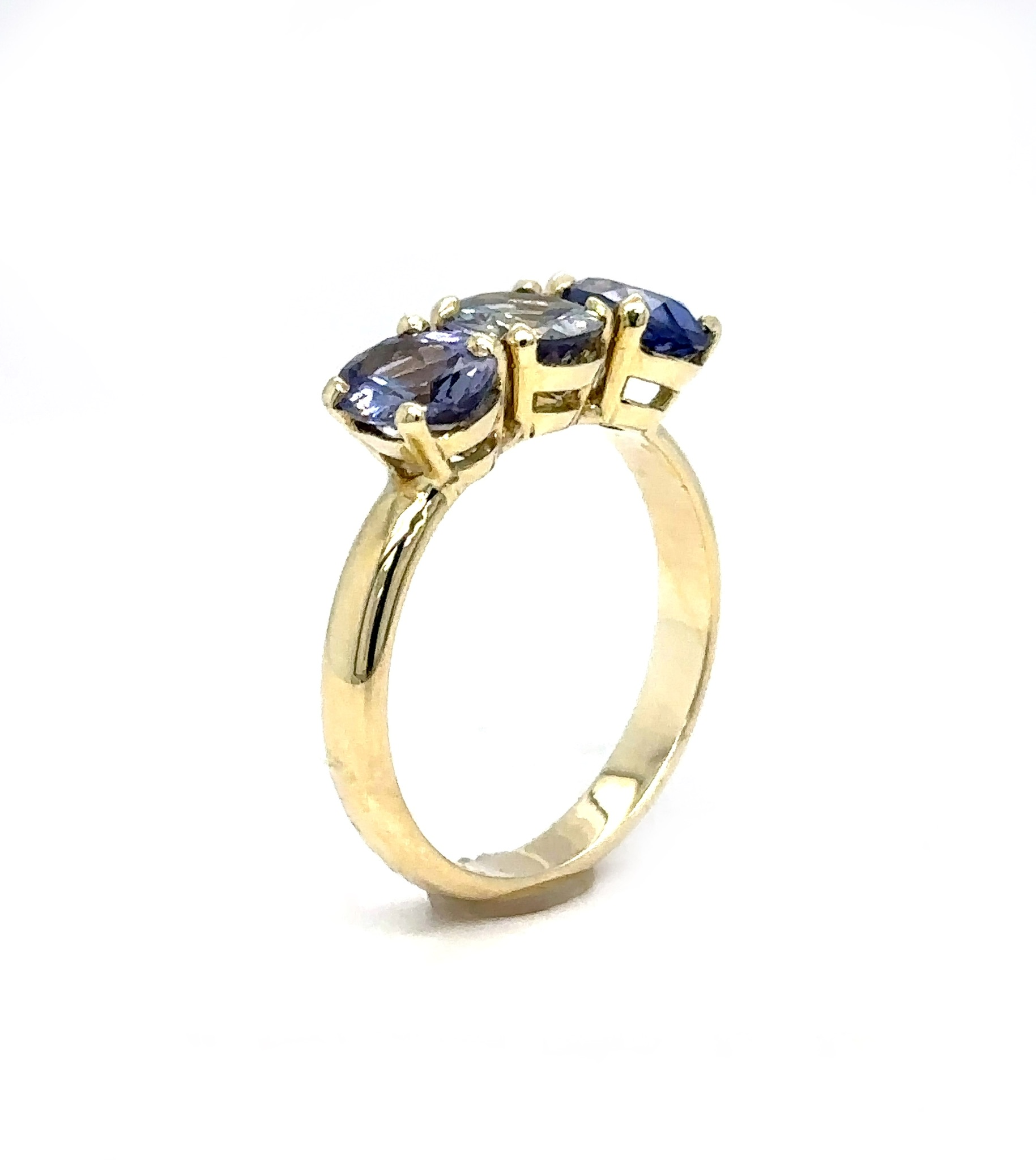 Het klassieke ontwerp in warm geelgoud biedt een tijdloos podium aan drie tanzaniten, die samen een harmonieus en evenwichtig geheel vormen.