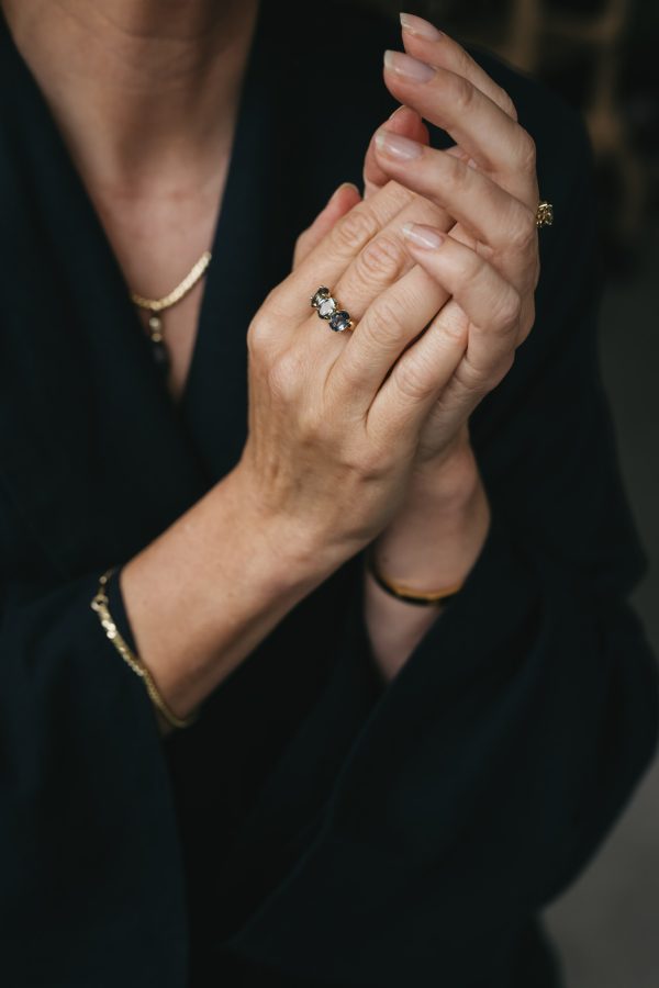 Deze handgemaakte ring is gezet met drie zorgvuldig geselecteerde tanzaniten, samen goed voor 2.80 karaat. Hun blauw-violette schakeringen lijken te bewegen met het licht en geven de ring een serene, bijna mystieke uitstraling.