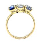 14 karaats geelgouden ring maat 18,5 met 3 bicolor tanzaniten 2.80ct