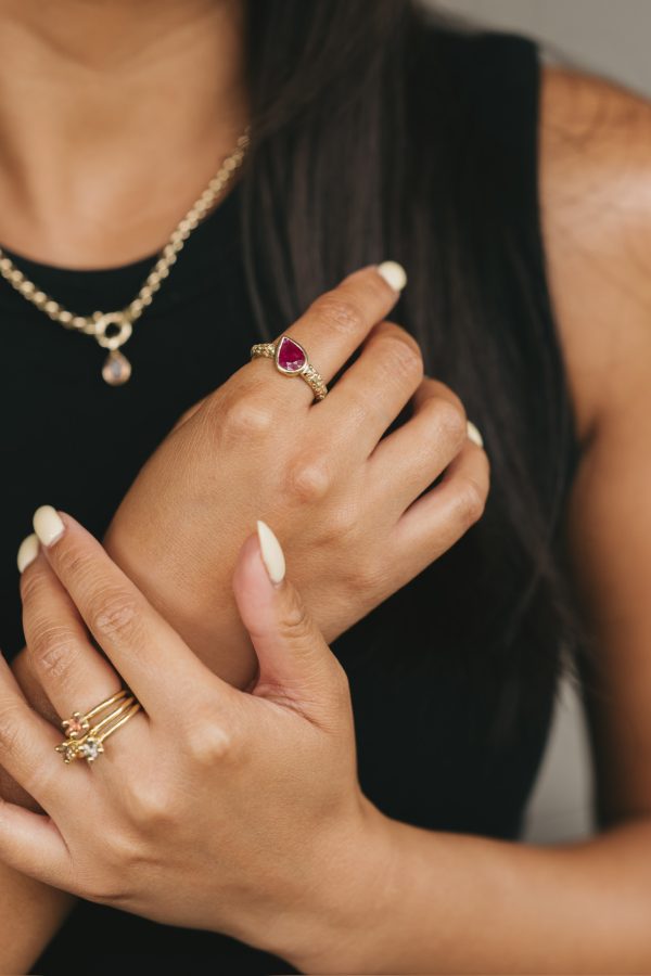 Met de hand vervaardigd uit 14 karaat gerecycled geelgoud en gezet in een elegante hoge chaton, straalt elke ring een ingetogen luxe uit.