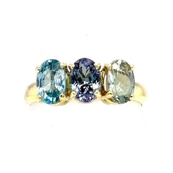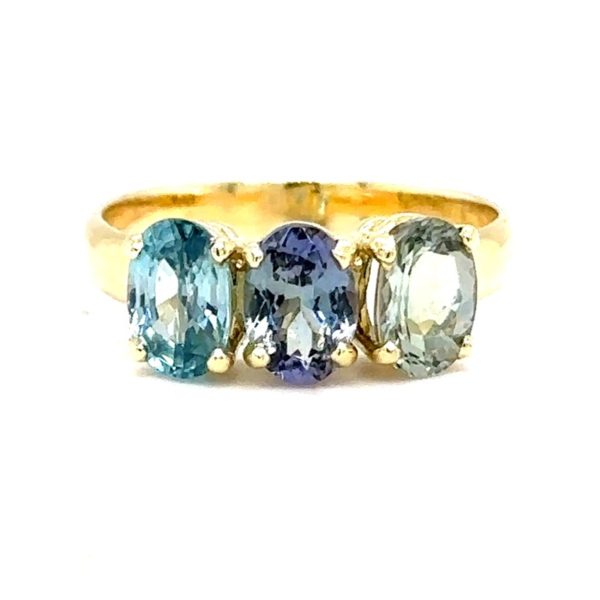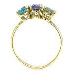 14 karaat geelgouden ring met twee keer een Tanzaniet en een Zirkoon Ringmaat 18 ¼