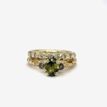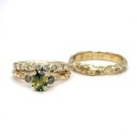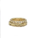 Haar ring is verrijkt met 7 warme bruine diamanten, zorgvuldig gezet in het oppervlak. Elk detail is met de hand gevormd en bewerkt, waardoor de ringen hun eigen karakter hebben. Stoer én verfijnd tegelijk. Zijn ring draagt dezelfde ambachtelijke structuur, waardoor beide ringen duidelijk één geheel vormen.