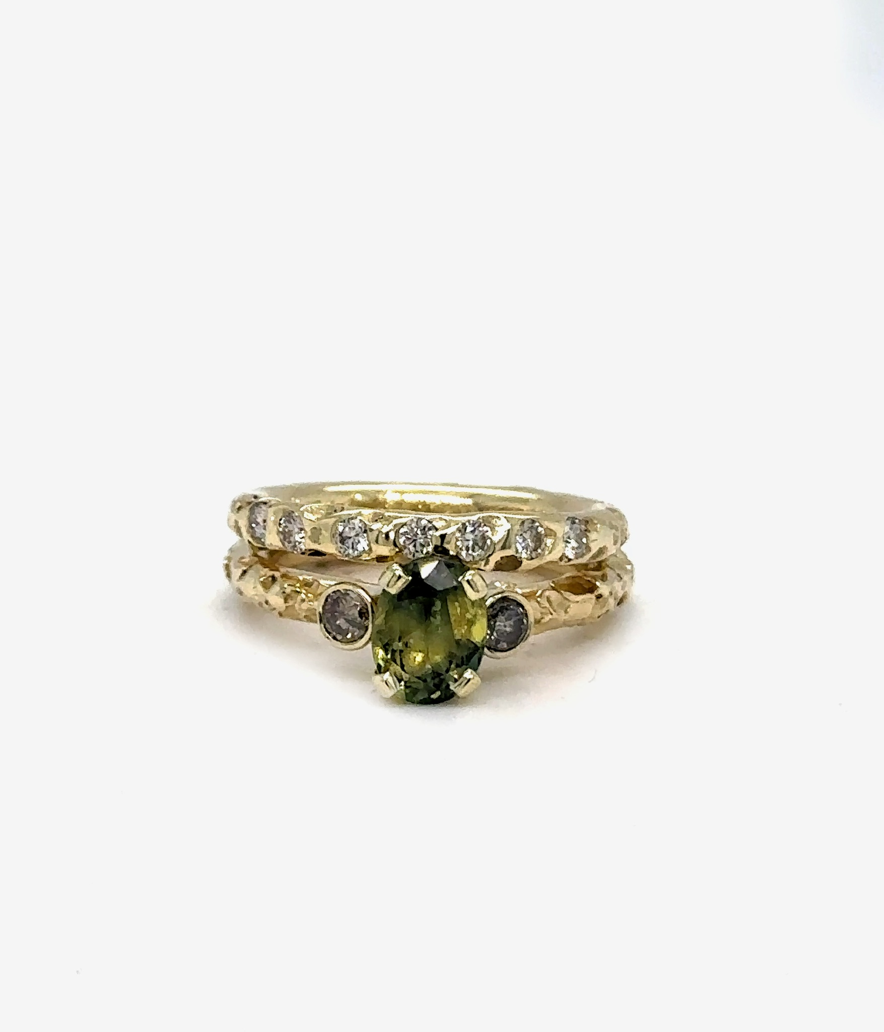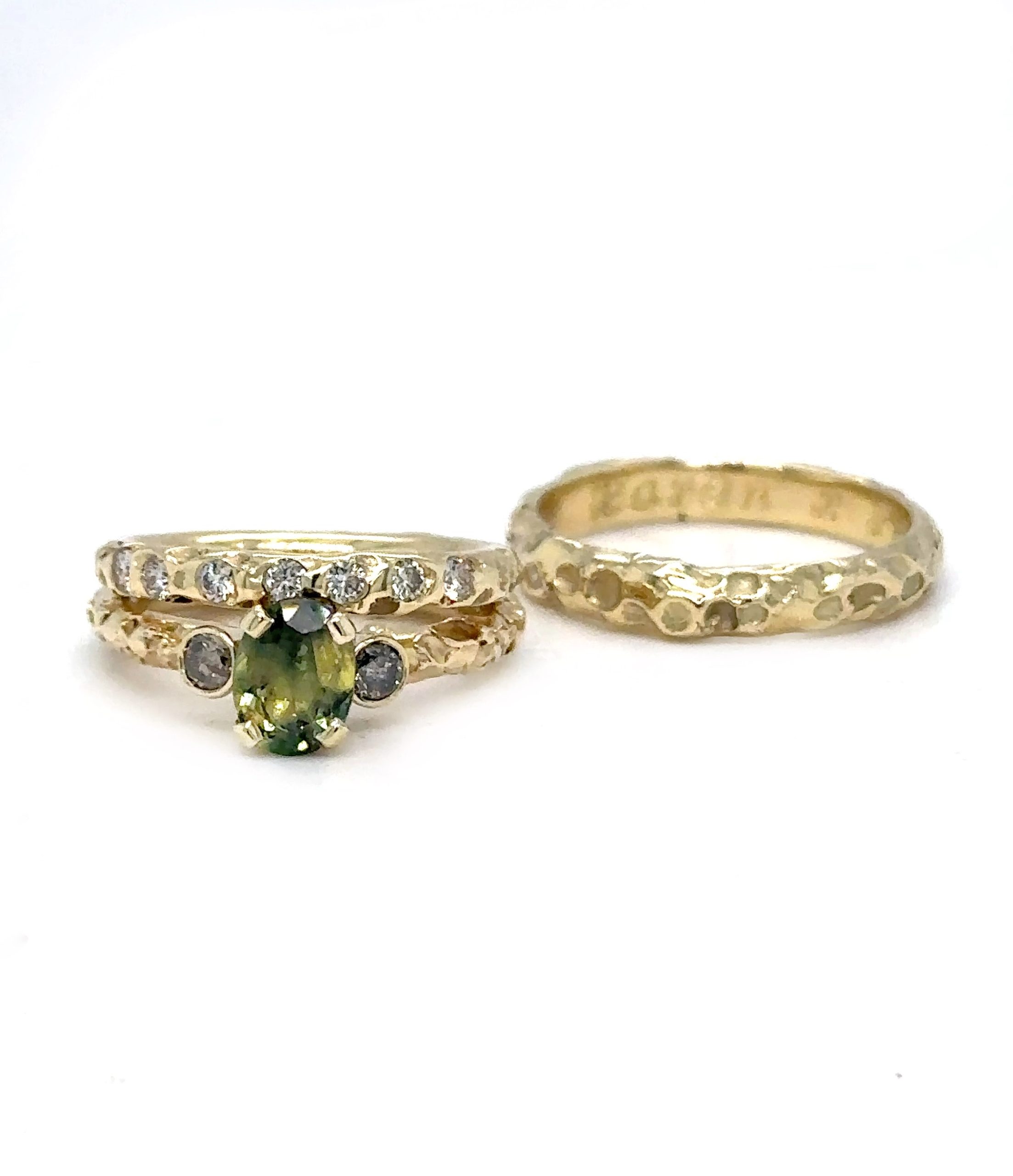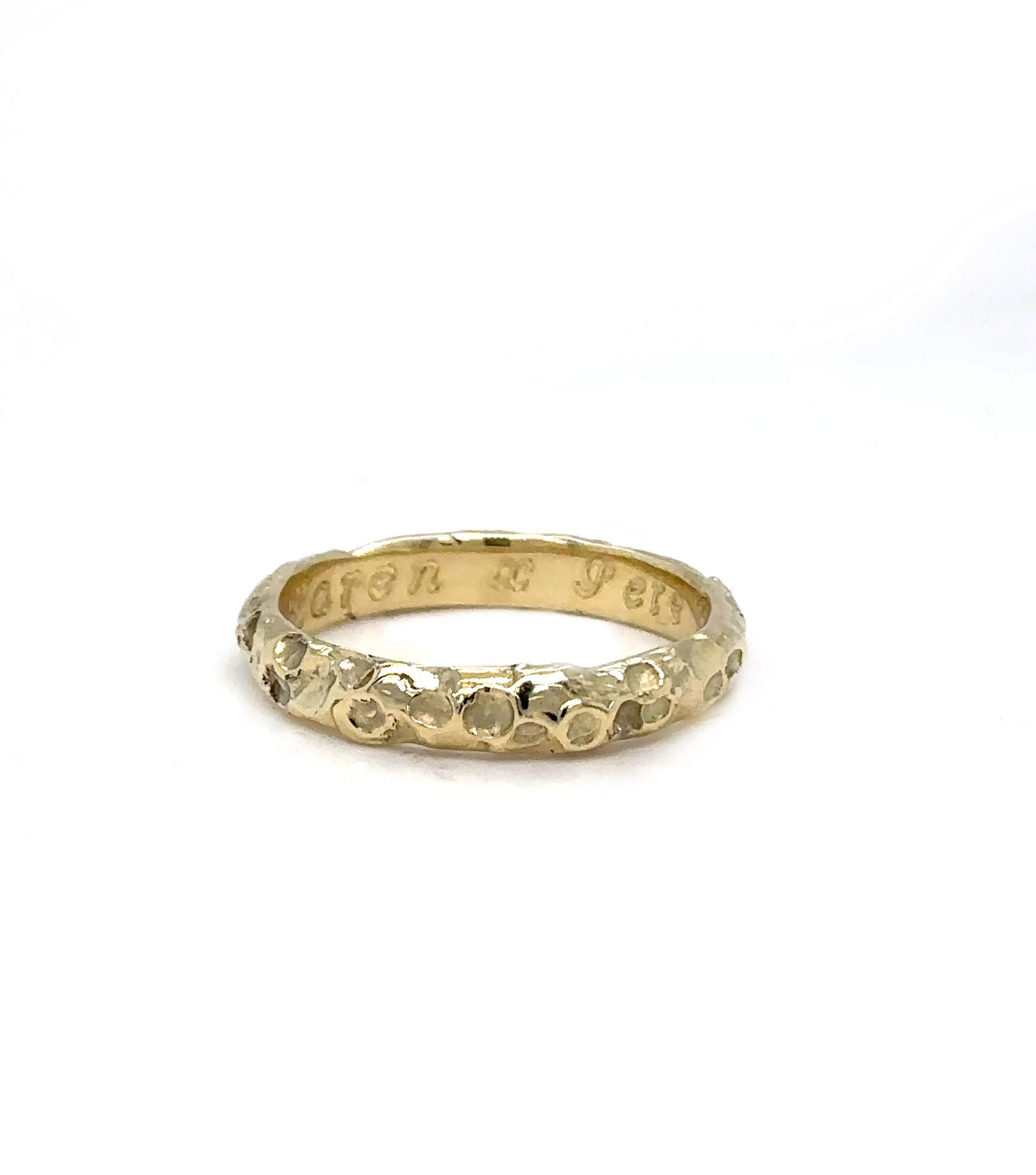 Haar ring is verrijkt met 7 warme bruine diamanten, zorgvuldig gezet in het oppervlak. Elk detail is met de hand gevormd en bewerkt, waardoor de ringen hun eigen karakter hebben. Stoer én verfijnd tegelijk. Zijn ring draagt dezelfde ambachtelijke structuur, waardoor beide ringen duidelijk één geheel vormen.